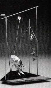 Trouble in Paradise, two sets and stage concern scale and context; the former is a seven-foot-tall humanoid structure that impels one-to-one interaction; the others, represented by maquettes, are 15-foot high metal tube and wire outline figures through whom the actor pass, as if jewelry is wearing them.