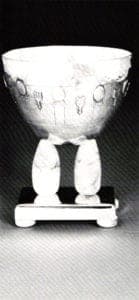 Another goblet produced in 1987 is probably more illustrative of the entire exhibition. It, too, is executed in silver and gold, but adorned with hematites and engraving. The engraving is beautifully executed and the various forms and ornament are integrated with subtlety and imagination. However, the interior finish of the cup is rougher than necessary and interlaces with the powerful iconography of the vessel. The feeling persists that unresolved conflict has been created rather than tension within a continuity of ideas.