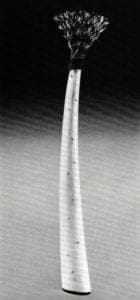 Penn relates her jewelry to weapons or implements and describes the pieces as being talismanic or charmlike. The intimate scale makes them so, but they lack the communicative power of a defined symbology. As pieces of jewelry they are striking, evocative and enigmatic. As objects they seem less like weapons and more like ancient tools used to apply paints and powders for ritualistic self-adornment. As forms, they are sensual and alluring, with even the long, slender brooches carrying an explicitly feminine quality.