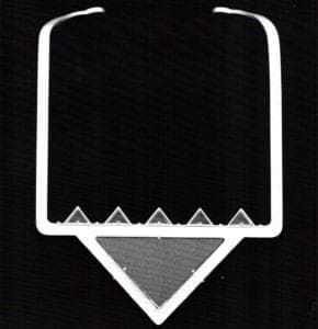 The jewelry of Beverly Penn is forceful as well as delicate, created by a careful eye and balanced in a way that can't be arrived at through symmetry. The strength of this work seems to lie in its contradictions. Her shapes originate from "shields, armor, tools and weapons" but the forms and colors have a sensuous quality that is decidedly feminine. Like Wood, Penn works in series, using the repetition of details to tie the pieces together. In one series, a gently domed disk seems to be both shield and breastlike. Small, rounded spikes interrupt the surface of the metal, sometimes arranged in geometric patterns but usually just emerging as random whiskers. Details hold much of the vitality of this work, using variations in line and discrete markings to draw the eye across a surface or around an edge.