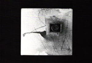If these pieces seem like preliminary studies, the subsequent group of eight enameled constructions is the culminating achievement. The plexiglass support that invisibly backed the copper plane of the preceding works is now expressed by the surface copper sheet, which is manipulated down and around the plastids edge. It is only an eighth of an inch in depth but it immediately transforms the object into a box. When the artist then cuts a single, off-centered window into each structure, framing it out from behind, she creates a new dimension. Each aperture is filled—with perhaps coiled copper wire, screening or a piece of etched steel-creating a "sous-relief," where the back is raised from under the surface. These apertures seem to be metaphors for the portals of mind through which Laskin herself has passed. There is a new expressionism as colors effortlessly float and hover on one surface, only to be charged by Twombly-like markings.