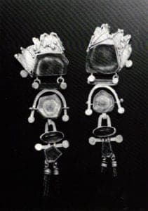 This most successful juried exhibit consisted of about 100 pairs of earrings. Well-lit and tastefully displayed, the work was shown in four wall cases, and there was quite a spectrum of talent, ranging from the classic artistry of Mariette Bevington to the dramatically beautiful Wild Indian II by Judith Kaufman.