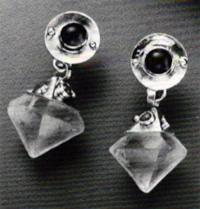 Elizabeth Prior's earrings featuring fluorite crystals were outstanding. They combined a sculptured, almost chunky quality with elegance. Deidre Donchian's Dream Seeker earrings were delightful compositions of rose quartz with textural pendant sections made of copper, sterling and brass. G. Phil Poirier's lovely earrings featured pendant fan-shaped, rosy colored lepidolate. A delight to wear, I should think.