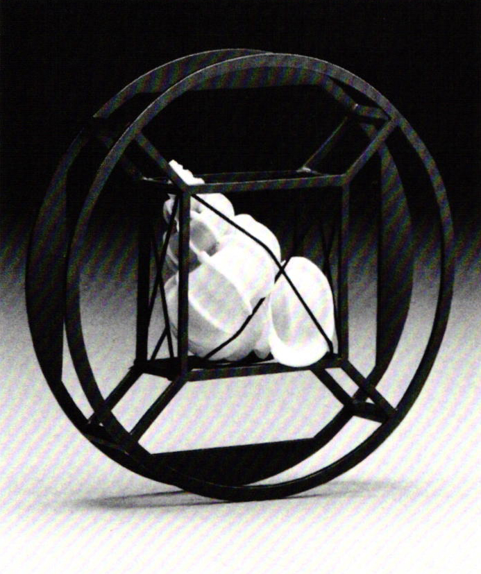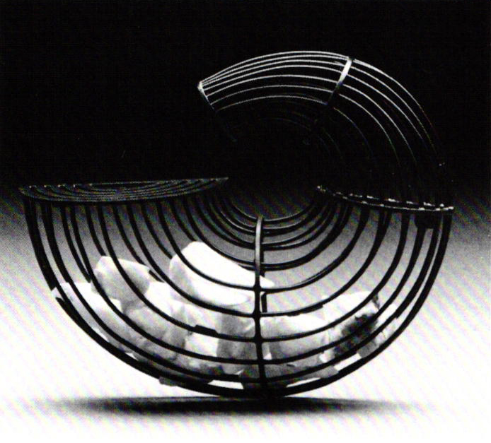 Another series sets a single shell into an open frame held tenuously in place by thin black threads. Intended to be the reinterpretation of what is often associated with kitsch or tourist-type jewelry, in this setting the shell transcends the commonplace is seen simply for its intrinsic beauty. The logarithmic spiral of the shell illustrates natural harmony and, like drawings by Da Vinci that diagram perfect human proportion, Wood's jewelry explores the relationship between an organic form and a system of order and measure. He is aware of how we exist in a world that imposes geometry on us, and his jewelry both refers to and makes use of the tension occurring at that point of convergence.