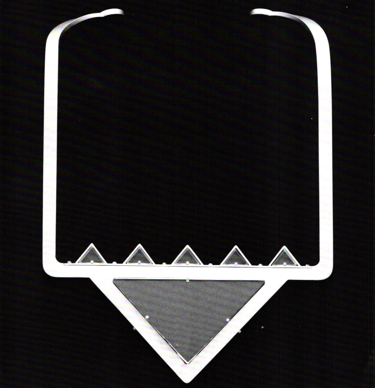 Metal, meanwhile, is everything in the new work, or so it seems with a first look at this suite of gold-plated brass works. Its role has become vastly expanded, both iconically and structurally, in flat, planer circular collars or triangular torques marked by curvilinear grace. Brought to the fore, the metal becomes important as a brilliant primary color as well as introducing the glass, which now appears refined as a unique element in the work. Actually, in this turnabout, a kind of alchemy has transformed—elevated—the glass to the status of well-defined gems.