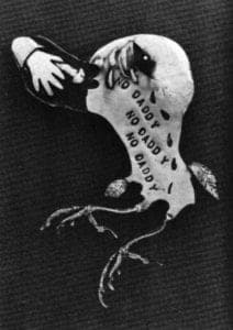 No Daddy serves as one of the thematic and emotional poles of the show. A small figure, with huge head and red bead eye cries a long stream of tears. From his/her shoulders sprout tiny vestigial golden wings - evocative of the limbs of a thalidomide child. Below the body dangles a pair of twisted fragile wren's legs. The lace is turned up towards a looming, cloudlike form, from which emerges a hand holding a penis. Stamped deeply, three times, across the child's face and body is "No Daddy." The aura of abuse and exploitation is palpable, and the piece rivets the viewer's eye, forcing a confrontation with usually ignored pain. This piece, which was once characterized as "too disturbing" by a gallery owner, has prompted tears and sincere thanks in some, discomfort and a sense of inappropriateness in others. The wearing of this piece entails deep emotional commitment and the wearer would truly have to share Palmer's vision and be willing to take it out into the world.