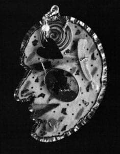Commonly valued stones and metals are employed in conjunction with unexpectedly prized materials, such as a cross-section of bone, a metal button, a flash of wrapping paper, a rupee note from Nepal, a tiny, sinuous twig, a piece of pencil, a fragment of a house key, the wing of a butterfly. These objects surprise us in their beauty and draw us into a curiously integrated world. Though each element remains discrete, they interact upon a vibrant, variegated plane, mutually reinforcing their preciousness.