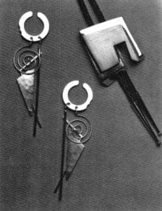 The Baker Gallery hosted an exhibition of nine Kansas City-based metalsmiths, most of whom trained at The University of Kansas in Lawrence. The work of husband and wife team Bill Ruth and Susan Mahlstedt revealed a strong sense of whimsy. Their pins, earrings and one necklace employed a variety of motifs, from architectural elements to arrows, cars, cows, fish, keyholes, ladders and palm trees. The pieces are constructed primarily of satin-finished sterling silver and acrylic, with some airbrushed enamel paint, 14k gold, onyx and lapis. Riveting and piercing are two construction techniques frequently used. Elements hang freely from the main body of the pieces, adding a sense of movement when worn.