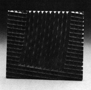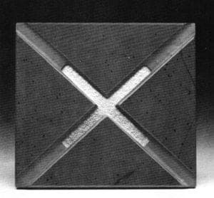 In Donald Friedlich's exhibition, visual simplicity and elegance belie an undercurrent of intellectual complexity. The works are divided into two series, Pattern and Erosion, and, with the exception of two bracelets, are all brooches. Created from stone or glass, each piece exemplifies Friedlich's sensitive appreciation for and deft manipulation of material. Several brooches (most are 1½ to 2″ square) contradict their natural properties by appearing to be synthetic: the glass brooches look like lucite; the onyx, rubber. This deception is underscored by the handheld weight of the brooches that actually appear light and delicate. The two agate bracelets do not partake of this strategy. They are large and forbidding, both visually and physically.