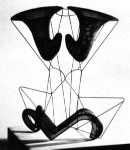 In contrast, the tabletop sculptures and their related wall reliefs are one step removed from his lamps and illuminated tableaux, transitional pieces that mark the shift from jewelry. In scale, they describe a torso with the implication of theatrical adornment, and as such they isolate more clearly McCormick's evolution from the semantics of constructivist jewelry: the abstraction of geometric motifs, the emphasis of volume over mass, the caged anthropomorphism, the delicate welding, the transparency of structure and, above all, a rationality of design that is physically alien yet cerebrally enticing.
