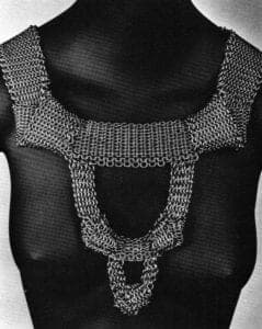 Ilana Painter, a graduate student at Kent State University, exhibited a series of jewelry in chain-mail. Her work went beyond the basic labor of making mail to create innovative forms of drapery. She exploited the fabriclike qualities of the material in rolled and folded neckpieces. She further departed from traditional mail in her use of patinas, bone and rubber O-rings. Though seen as adornment, the drapery maintained the essence of mail, conveying a Protective armorlike quality. The work succeeded in balancing the use of a familiar reference with new colors, forms and contexts.