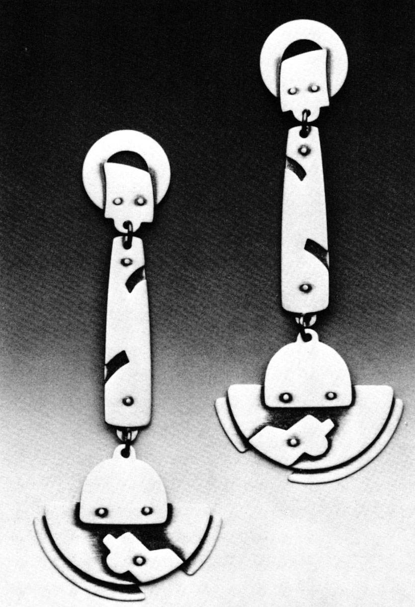 The Baker Gallery hosted an exhibition of nine Kansas City-based metalsmiths, most of whom trained at The University of Kansas in Lawrence. The work of husband and wife team Bill Ruth and Susan Mahlstedt revealed a strong sense of whimsy. Their pins, earrings and one necklace employed a variety of motifs, from architectural elements to arrows, cars, cows, fish, keyholes, ladders and palm trees. The pieces are constructed primarily of satin-finished sterling silver and acrylic, with some airbrushed enamel paint, 14k gold, onyx and lapis. Riveting and piercing are two construction techniques frequently used. Elements hang freely from the main body of the pieces, adding a sense of movement when worn.