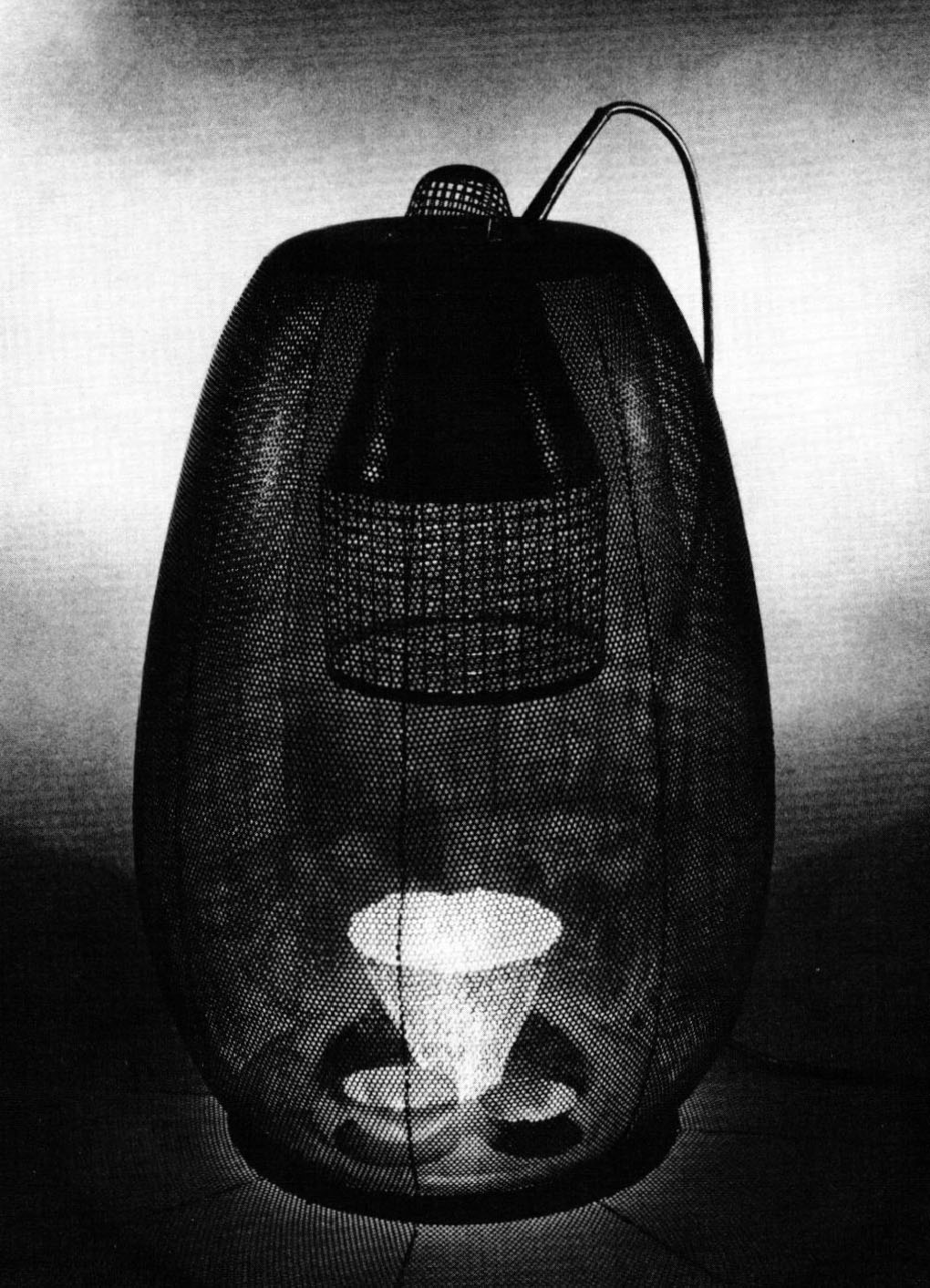 As a result, they lay a foundation for appreciating the radical achievement of the two illuminated tableaux. Bird-cage in size, they are enclosed steel-mesh containers with a suspended quartz halogen lamp that casts a glow on an assembly of austere perforated vessels at the base of the cage. The primary subject of the composition is light, contained within the piece rather than transmitted out into the room, closely resembling the inner luminosity of a thick glass form. Tension is created in our feeling that more exists than we actually know, that there is more light than matter, that material forms result less from the reality of Fabrication than the illusion of light's refraction. The effect is surreal, with the holloware a mirage, dematerializing into what McCormick calls ghost forms of itself.