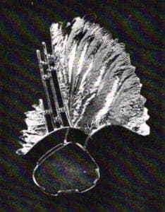 Her 1967 Wheatfields necklace is vibrantly alive with its looped and bent silver wires waving in the wind. Another early piece, a pectoral shield with its parallel bronze and brass straight lines soldered to a curving frame, is a feminine protective vestment suggesting the intuitive needs of the inner self-protected by rationalist outer behavior, the "thinking woman's" body sculpture.