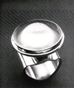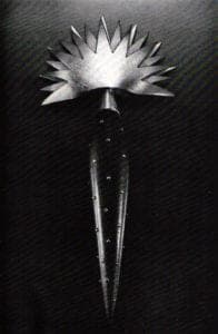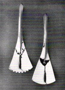 Though Boris Bally's work resides on the borderline between straight-forward design and exploratory craft persuasion, the sense of use in his work is requisite. His candleholders, corkscrews and flatware have an inventive edge. While his feel for engineered design comes through in his jewelry, it is particularly evident in his blending of art and usefulness in corkscrews and candleholders. Though many of the flatware and sterling silver candleholders are driven by a functional schema, others, such as his sterling, aluminum and concrete candleholders, transcend everyday usefulness. It is the symbolism - hand holding a disk, ring with ball hanging in the center of the candleholders - that adds a twist and suggests a higher aim. An enigmatic quality drives one to contemplate these objects.