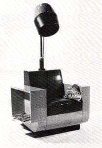 Among the more amusing pieces were two artists looking at the 50s. Shag Herndon's '49 Ford Auto Sofa was the rear end of a 1949 Ford, with an upholstered seat of shiny red vinyl inserted where the trunk had been. Eric Margry took an old hair dryer, dressed it up with new paint, added a brand new square chair of bright pink formica with little turquoise kidney line drawings and a red vinyl seat and changed it into a lamp. Copies of the National Enquirer, etc., provided the proper ambience for his Gossip Information Chair. Totally, tastefully, tacky.