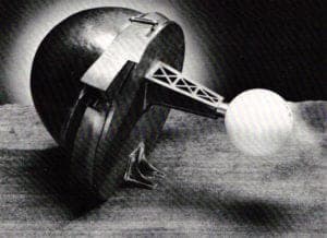 The 1990 teapot with field hockey ball signals LaFollette's current direction. The teapot, at this point, has been deconstructed and transformed into an improvisation of disparate parts. Using the containment/growth/tension inherent in organic forms as the theme of the body, he applies a swirling line around the pot, ending in an industrially derived spout. One side of the pot is cut off and a miniature, mufflerlike, trussfragment attached. A field hockey ball - the teapot handle - attached to this strut acts as a compositional foil. The industrial effect is enhanced by the tarnished steel-wooled finish. LaFollette's witty improvisation the muffler and hockey ball assemblages adds a note of droll humor to the otherwise melancholy field of teapot forms in metalsmithing.