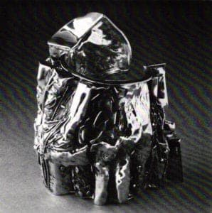 The exquisite mushroom container produced near the end of LaFollette's Euthanasia series holds a fascinating irony. We know the shapes and colors foretell doom. They are all there; but though it is a straightforward metaphor for the atom bomb, it is ironically an esthetic container. A low, hooded, cone-shaped main body has a fat, purple-red patina; the color is neither cool nor warm. The highly polished cover rises from the base into a mushroom shape; copper at the bottom, it rises to silver and brass, married metal at the top. It is this married metal combination that suggests white heat. The effect is arresting. What makes the irony work is LaFollette's restrained narrative against a strong container esthetic. We are struck by its beauty and horrified by its subject. He has created a perfect metaphor for our fascination with the power of the bomb and simultaneous horror of its destructive power. This schema of repelling/compelling also is apparent in the Euthanasia cups; vertebrae seem paradoxically tragic and beautiful as bases for the elegantly formed copper bowls. Other pieces in the Euthanasia series tip the balance toward the morbid and are clues to the strong ironic imagery in his later work.