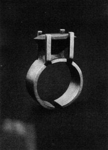 The artist promotes dualities in his ring forms. For example, some pieces were meant to be worn paired on the same hand. In one such pair, made respectively of silver and gold, one is pyramidal in structure, the other a trident shape in profile. One is tubular, the other square in section. Two other rings were particularly strong in design, complex and innovative in concept. The first is a gold ring band incorporating a gold mesh and seed pearl drum, which supports an unusual crystal. This ring is quite sculptural and spatially complex when compared to the mounted magnet ring. The matte finish and mechanical quality of that ring give it an other-worldly feeling, almost as if it were a relic or ritual object of an alien civilization, a civilization much more advanced or much more ancient than ours, and maybe not of this earth. This quality is achieved through deceptively simple means.