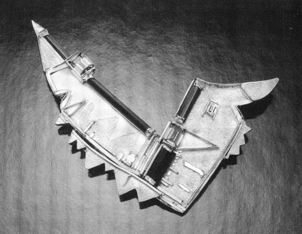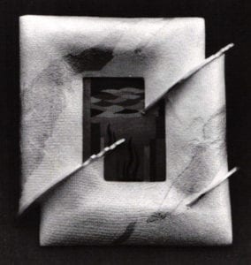 Holder's most impressive offering, however, is her witty substitute for a pocket handkerchief. These pocket pieces of fine silver glued over wood consist of squares placed in the pocket, with other pieces attached to the edges by hinges. By rotating these appendages, the wearer can create literally "outstanding" wearable sculpture that may protrude into space for several inches or be arranged to hug the body. Thanks to Holder's willingness to challenge the wearer's inventiveness, the choice is ours.
