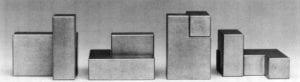 In her 1990 cube necklaces, Holder begins to move away from the worked, oxidized and gold-rubbed surfaces of earlier pieces, using subtly brushed silver, zinc and stainless steel. At the same time, she allows an element of randomness to enter into the way a wearer might arrange her jewelry. Her zinc cubes may fit together in positive-negative perfect geometries when off their steel circlets, but on the body, they not only break apart but conceivably can be rearranged by the wearer.