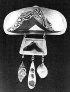 In Laken's most recent brooches resembling seed pods or shells - secured by separate, rippled lengths of mokumé - the contrasts between densely patterned flat edge and unpatterned convex core, or vice versa, again highlight the artist's mastery of mokumé. Technically brilliant at creating precisely delineated patterned and plain areas from a single piece of layered metal, she is no less adept at allowing the motion suggested by the metal grain to develop. This exploitation of the medium's inherent possibilities invests shapes which otherwise would suggest calm and stasis with a new, intriguing dynamism.