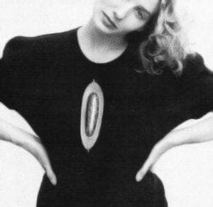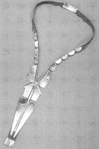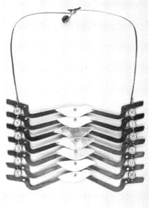 Another piece, Protection, according to the artist's statement, is the first piece in her "Homage to the Ethnic Jewelry Ancestors." She states, "The Sioux breastplates of bone have long attracted and moved me both as ornament and symbol - the idea of wearing ribs on the outside" (thus the name). In the case of Protection, however, the bones of the breastplate are used yellow pencils. Woven together with horsehair and brass fittings, the breastplate, like its antecedents, has small objects such as mirrors, bits of deerskin, brass and coins attached to its "bones." One of the ornaments, an Indian head nickel, reiterates its native origins, the word liberty on the coin's face reminding the viewer of the ironies of the fate of the Sioux tribe.