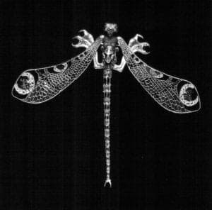 Lalique was obsessed with complexity and contrast. Why use simple round wire as links in a chain when twigs or violet blossoms wrapped around themselves would serve the same purpose? Why make the fronts interesting bur not the backs? Why set a stone in a plain bezel when it could instead be held by intricately chased oak leaves? Some pieces such as the Dragonfly Woman Corsage have incredibly delicate wings of plique-à-jour enamel, yet hawk-like talons of gold ready to claw the breast of the wearer. The delicately carved horn Hortensis Blossoms Hair Comb, with touches of gold, enamel and diamonds, is the quintessence of beauty though dead and wilted. Did he succeed in spotlighting beauty that one would never have recognized otherwise? Would wasps and beetles be allowed to encircle jewelry were they not so carefully rendered?