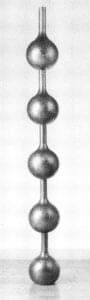 Decisions epitomizes Hollern's concerns about the exploration of ideas. This most recent work relies less heavily upon the traditions of hollowware and addresses more the artistic concerns of sculpture. Over 4 feet in height and length, it combines steel, wood, pewter and bronze. A center needle rises from a wedge, shaped rocker. On one side of the rocker rests a pewter heart, while on the opposite side rests a stylized brain. The piece evokes the need to strike a balance between the joy of simply working materials and the concepts which they are capable of communicating. No matter how far tilted, the sculpture always returns to a center position of balance between the extremes of head and heart.