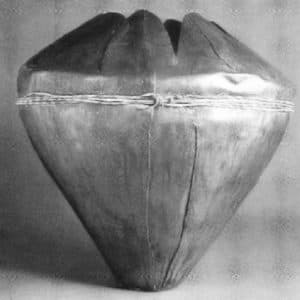 Coogan's vessels are clearly about inquiry. In his artist's statement he describes his interest in "primitive" or archaic cultures and his fascination with the questions raised, through the excavation of relics, about these cultures. His vessels seem particularly relevant in a society in which the past often extends no further than one's grandparents and mystery usually means the latest suspense film. Bound, with the form and burnished black-brown color of rich, primitive-fired Pueblo clay pots, can be read as a container for the ideas and spirits of that nation. The sacred circle, made of twisted wire, tightly binds the chest, and the vessel in its fullness seems close to bursting. We might have learned how to live on this planet from a people who felt all things were connected and that man was merely a strand in the web of life.