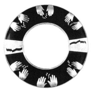 Seance, a wide, collar-like disc reminiscent of those worn by Masai tribesmen, is made from a long-playing vinyl record. The rim of its inner circle is trimmed in bronze. Sterling silver and copper silhouettes of hands and indecipherable scribblings, along with a bronze silhouette of a face, are meticulously pressed into the disc's surface, evoking an overall sense of mysticism.