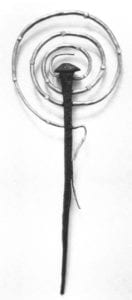 In Symbolen, a group of bracelets from 1986, Peters focuses on the space within the form. The bracelets capture the wrist in linear forms of gilded brass made from flattened rods. We are mindful of the intimacy of the union: the encircled, gently squeezed arm is as important as its cage. In Spear Cloud, and Capital, the artist communicates the line with whimsy and élan.