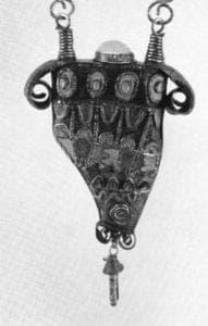 The exhibit also included the work of four enamelists, Colette, Deborah Lozier, Marianne Hunter and June Schwarcz, each with a very distinct approach to the medium. Lozier's alluring, poetic pendants look like ancient neckpieces rescued from the jewelry box of Scheherazade. They were suspended in a narrow glass case which allowed the viewer to see both of the elaborately worked side of each piece. In the same display was Japanese Palimpsest, a 24k gold, palladium, anodized niobium, 14k gold and onyx neckpiece by Florence Resnikoff, and two pendant brooches by Judy Bettencourt.