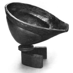 More traditional steel-working techniques were embodied in three, Zen-like paperweights by John Fick, the forged steel furniture of William Roan, and the eloquent Seamless Hollow Form by C. Carl Jennings. Jennings's raised, forged steel bowl, set on its own horseshoe-shaped "pedestal" was a fitting reference to the artist's personal history as a third generation metalsmith and to historical metalsmithing in general. This bold, sensitive piece was a pivotal one in an almost overwhelmingly diverse collection. "I like to think of myself as a pretty good problem (sic) solver," Jennings's statement explains ingenuously, "and working with steel in the weights that I do creates a lot of problums."
