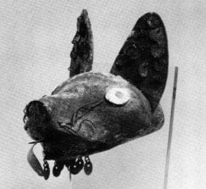 In fact, animals held such powerful sway - owls, for example, because of their prowess as hunters - that they graced nearly every ornament. The other most frequently expressed motif was the image of the Decapitator, consistently depicted as a fearsome male figure with feline eyes who seems to be coming right at the viewer holding a tumi, a rounded ceremonial knife, in one hand and a severed human head in the other. If a cartoon bubble were to come out of his mouth, it would simply say, "Aarrgh!!" No one needs a caption to deduce the reverence he inspired or to understand his function in ritual sacrifice.