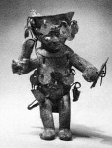 It was this preoccupation with all things golden that must have inspired the experimentation that led to their amazing feat of gilding copper. According to Heather Lechtman of the Massachusetts Institute of Technology, this is how they may have achieved it: Gold was dissolved in a mixture of water and corrosive minerals (salt and potassium nitrate were locally available), to which was added a compound like bicarbonate of soda to create an alkaline pH of about nine. A clean copper object dipped into this solution became both anode and cathode, which supported an electrical current, and when the object was boiled allowed it to be coated with the thinnest layer of gold. The object was then heated to between 500 and 800 degrees Celsius (932 to 1472 degrees Fahrenheit) to permanently bond the gold to the copper.