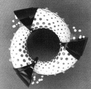 In this environment of retrenchment and restraint, Peter Chang's marvelously excessive plastic jewelry is truly refreshing. While he makes earrings and pins, his large (6″ to 8″ in diameter) bracelets are by far the strongest work. He starts with a carved core of polystyrene foam, which is encased with many layers of brilliantly colored polyester resin and, occasionally, formed acrylic sheet. In spite of their size, the bracelets are very light and surprisingly wearable, as well as durable. The forms are bulbous, sometimes vaguely mechanical and sometimes insect-like. Colors are usually highly saturated primaries, often played in opposites like purple against yellow, or red and yellow against blue. Primary colors are complemented by occasional pinks and mauves. The net effect is reminiscent of the psychedelic posters of the late '60s. Only flashing neon could create more jangling, high-volume color.