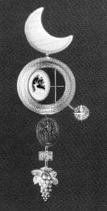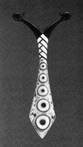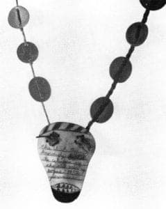 In U.S. Treasury, Buehler creates a bone skull and penny neckpiece, a rosary for the postmodern era. I could almost see a junk bond king fondling its pieces while talking on the phone, moving millions of dollars from here to there, emptying the pockets of workers, and filling his own. The piece seems to tell us that traditional institutions and cherished beliefs are decaying; religion and economics are enmeshed. U.S. Treasury could be an icon for a belief system of turmoil and greed.