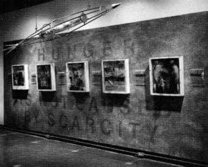 Political, social and religious issues that prevent food from reaching the hungry are the topics addressed by the pieces. The wall sculptures that form the Hunger Series are prefaced by printed statements on hunger such as "American consumers save, on average, a nickel on every hamburger imported from Central America, but the cost to the environment is overwhelming and irreversible." Smaller amulets are showcased in Plexiglas and wood wallboxes. The Space Frame series is made up of sculptures and jewelry in the forms of metal grids which hang from the ceiling and are welded with objects that are both new and recycled. The shapes of these grids resemble missiles and bombs. These large three-dimensional sculptures frame photographs, bullets, barbed wire and grains. A group of metal neckpieces have engraved titles such as "The Future is Not Set" and "There is No Fate But What We Make." They are utensils in a sense: one spoon shape is wrapped with barbed wire while the handle, a plastic vial, is filled with rice.