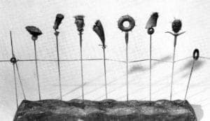 While the Schencks focused almost exclusively on metalsmiths whose work is media-specific - i.e. metal is paramount to what they do - in an effort to recognize the gray area which joins metalsmithing to other art forms, they purposefully included a few artists who might be regarded as sculptors or mixed media specialists first, and metalsmiths second. Self Portrait C by Carl Dern and ?Como? Flecha Amarillo by Lynda Watson-Abbott stretched the definition of "metalsmithing" into the realms of sculpture and mixed media, respectively.