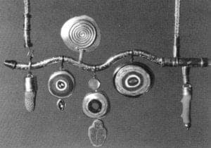 As Loma Negra: A Peruvian Lord's Tomb clearly shows, the Moche, a coastal people who inhabited a 250-mile stretch of northern Peru from about 100 to 800 A.D. pushed the metallurgy envelope. Expanding on the technique of finessing hammered sheets of gold into finery, the Moche elaborated on the quality and quantity of designs and created objects in low relief and three-dimensional sculpture; their technological repertoire also included lost-wax casting and the alloying of metals. As their aesthetic concerns encompassed the contrast in tonalities among copper, silver, and gold, they deftly joined them into a single ornament by edge welding, crimping, and tabs, then added garnishes of spangly disks that moved freely to capture light and enhance the radiance of the metals.