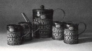Eaves use of the domestic object (i.e. kitchen appliances or utensils) shifted from the usual contemporary feminist strategies to a perhaps radically "new" nonsexist position: the common ground of equal gender usage. In the two coffee sets entitled Last Drop and From The Mountains, the functional object percolates in its "self-ness" and a phenomenological exploration of coffee, pot, and cup. Maxwell House and Folgers brand cans supplied the artist with contemporary materials, a visual bite familiar to every grocery's customers. These printed labels, transformed to appropriate decoration, brewed poetic justice to the art of advertising. The playful use of hole-punched cans for the basket and colorful jam jar tops for the stem's base, produced an uncanny effect upon lifting the lid of the coffee pot. The artist's research on and use of traditional tinware forms and techniques, such as turned edges and lapped and tin soldered seams, imbued the artwork with historical presence and authenticity.