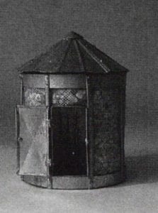 Departing from the playful arena, the final works in the show reaped a respectful tribute to the Southern farmer. Three jewelry boxes miniaturized the structure of the rural landscape. In Corn Cobs and, Corn Harvest, small scale versions of two styles of corn cribs fulfilled their function as storage containers. The jewels they contained were not only precious corn seed and dried cobs but equally valuable tools of the harvest: a tiny tractor pulling a four row corn planter and a combine with a harvesting head. Both implements were intricate sterling brooches. In these pieces, Eaves effectively cultivated a reverence for the work and tools of agriculture and their products. Another jewelry box was the charming How Sweet the Sound. A replica of a Southern Baptist church, this musical piece played the hymn "Amazing Grace" when the roof/lid was lifted. The empty interior reflected the individual quest to satisfy one's inner spiritualism.