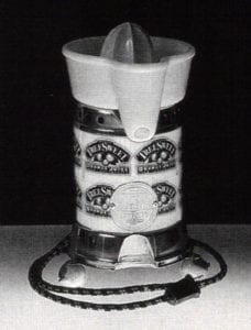 Also keeping with the kitchen theme was Juicer. This appliance comported a monumental stance as it tiptoed on little plastic orange refrigerator magnet feet, wearing "TreeSweet 100% Orange Juice" labels around its midsection and a shiny white ceramic squeezer hat. Eaves replaced the original electric cord with one fittingly colored black, yellow, and orange. The pop rivet and tab construction added to this operable Sunkist Juicit contributed a frivolous humor.