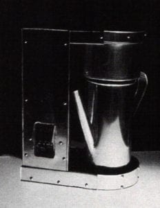 The daily ceremony of breakfast was awakened in Contempotin by the provocation of a tin plate auto-drip coffee-maker. The coffeemaker wore the serious architecture of industry: shiny tinplate, sleek form dotted with pan head screws, a heavy utility cord with a three-pronged plug, and a perforated aluminum sheet used for the water pour and basket areas. The integration of industrial material and methods stressed the work aspect of the auto-drip. The beverage labored from this appliance is a strong cup; no demitasse dessert brews allowed!