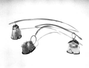 Wearability and scale problems aside, Laurie Hall needs to seriously reconsider a number of things: wit over seriousness; loose over tight; and puns over symbols. Fallen far below her own standards of technique and meaning of a decade ago, she now must approach sculptural jewelry anew rather than reiterate and recapitulate, rush and recycle.