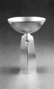 Jack da Silva mentions in his artist's statement that his ancestry is of a family of artisans. "Learning to work with my hands was a natural part of growing up. Everyone, it seemed could rearrange material…" Jack has taken this passed down talent and added an interest in ancient and traditional metalworking methods. His immense abilities in traditional raising techniques using copper and silver are truly inspiring. He adds to this skill a graceful simplification of design. Two recent sterling silver works, Chalice, 1992, and Pitcher 1993, are premier examples. The two have such an airiness in their creation that they look light to the touch. They bring to mind the legacy of the Bauhaus and its traditions of form following function and a refined aesthetic of clean related design elements.