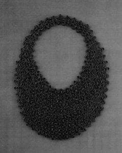 Another necklace was composed of a subtle graduated progression of delicate, slightly domed discs. This thick heavy strand of silver looked much like a long flexible pine cone cascading nearly to the waist of the wearer before looping back up to the neck.