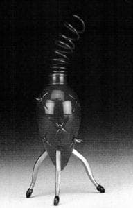As Marth writes in her statement, the title of the exhibition refers not to an excess of technique or of decoration but to an excess of emotion. Marth's perfume bottles and pepper mills, in particular, use vibrant colors and funky forms to convey the heat of passion or the intense grief of loss. It is not difficult to discern that Smoldering Red Mattress expresses the former. The body of the perfume bottle is a brilliant, shiny red and appears quilted, resting precariously on three burnt matches. Flames burst from the seams of the quilt and a spring - as in a 'sprung mattress' - forms the lid of the bottle, with a burnt match acting as stopper. Reality Strikes through deflated memories of the past records the loss of parents and the resulting loss of future moments and memories. The pearl-hued bottle appears wrinkled and flaccid, and is described by the artist as a deflated sack of memories. A small hand reaches from the lid of the bottle in the universal gesture of a child seeking a parent's reassuring touch. Using these bottles continues the narratives' as you grasp the child's hand and dab on some perfume, stimulating memories and enhancing sex appeal.
