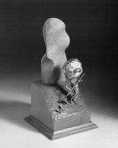 Marilyn da Silva's creations are windows into her life. The Pillow Box series from the mid 1980s look as if they are made of lacquered wood instead of metal and paint. They tell of the precious time spent in the Far East. In the Above and Beyond series she takes elements of Eastern and Western design and lets them do battle as she creates wonderful 24 x 24 x 24″ sculptures out of copper, brass, bronze, steel, gesso, colored pencils, and paint. These works could all be blown up in scale to create captivating major outdoor sculptures. They illustrate a voyage Marilyn has taken to find her style and materials (Above and Beyond V even looks like a boat at sea). They also foretell the more narrative approach to come.